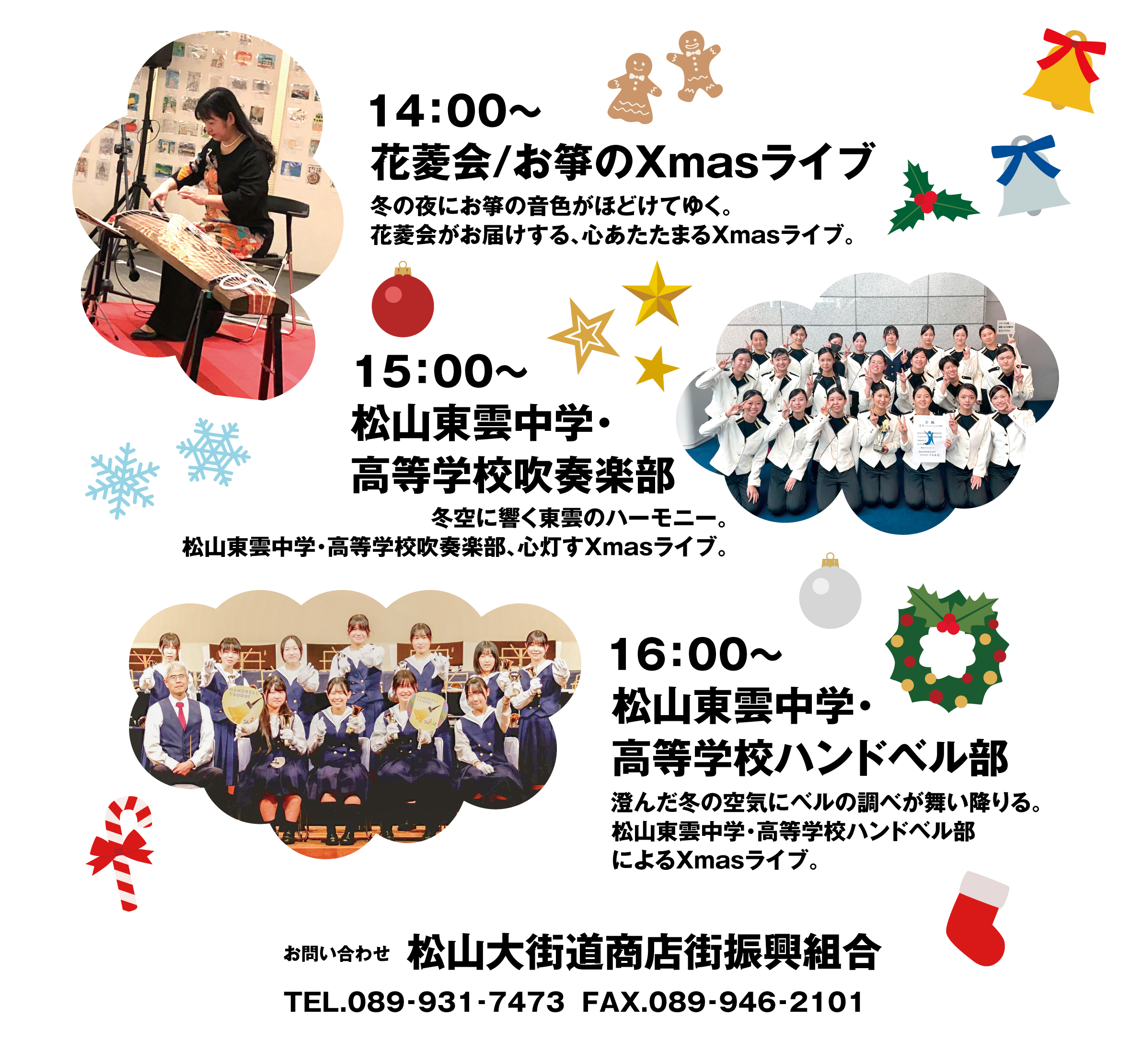 和の音色で奏でるクリスマスソングから、元気をもらえる吹奏楽、そして聖夜を思わせるハンドベルの響きまで。 地元・松山で活躍する奏者たちが、冬の透き通った空気に美しいハーモニーをお届けします。 大切な方と一緒に、または自分へのご褒美時間に、ぜひお立ち寄りください。